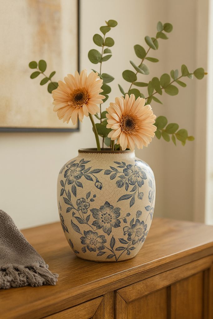 Add a timeless touch to your home with this vintage-inspired blue floral ceramic vase. Styled with soft peach gerbera daisies and fresh greenery, it creates the perfect balance of elegance and charm. Ideal for console tables, living rooms, or entryways, this vase enhances any space with its classic craftsmanship and cozy vintage appeal. Make your home Pinterest-worthy with this beautiful accent piece.
